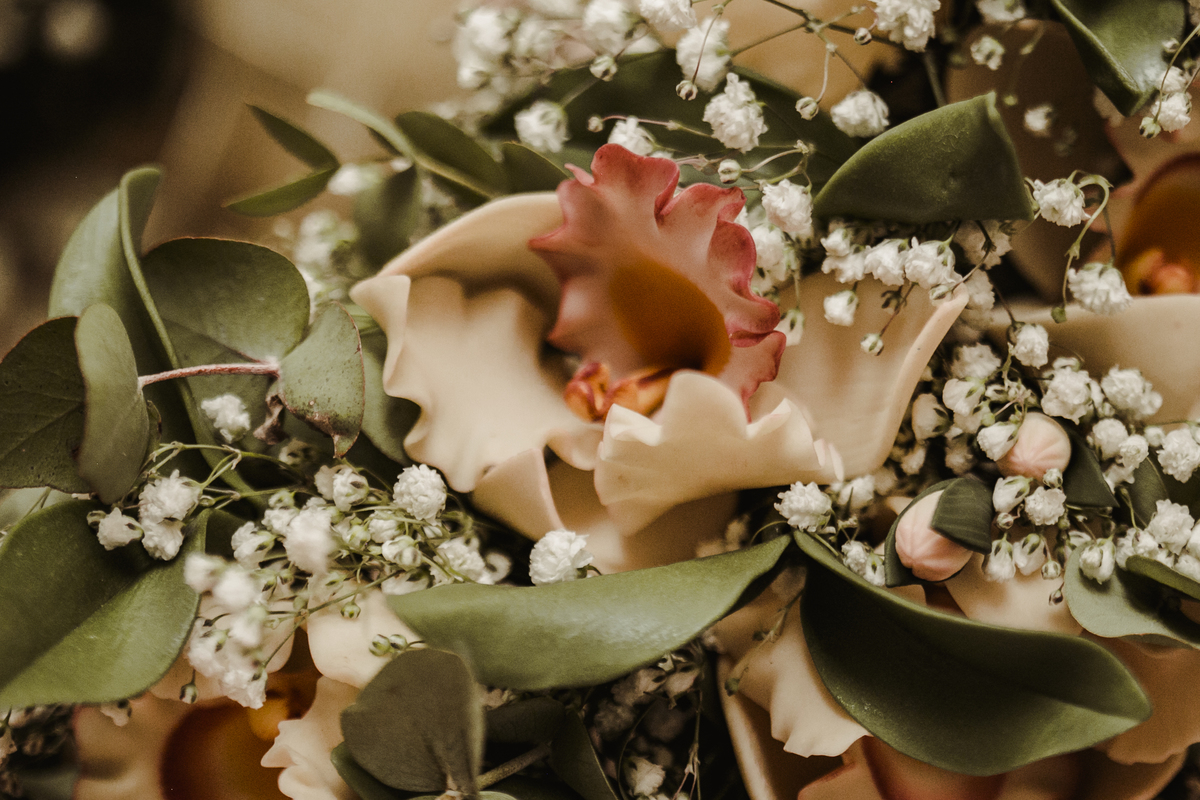 Mientras Moni se preparaba en la habitación del hotel, me contaba lo feliz y lo segura que se sentía este día. Y me hizo un pedido especial, la foto del ramo. Una foto que como fotógrafa hago siempre, pero porqué era tan especial ese pedido? Porque ese ramo se componía de orquídeas y hojas de porcelana que la mamá de Moni lo hizo con sus propias manos hace 20 años atrás, y lo hizo exclusivamente para el día de la boda de su hija.